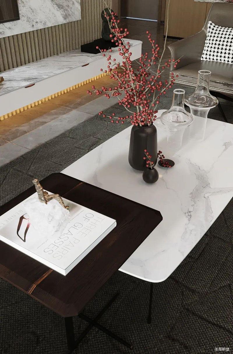 純美的線條,沉穩(wěn)的色澤,為空間定下了低調(diào)而華麗的基調(diào)。渾然天成的實(shí)木與巖板紋理,讓角幾蕩漾出一幅“水光瀲滟”的潑墨油畫。三兩紅枝點(diǎn)綴,表達(dá)著“枝頭并蒂祝吉祥”的美好祝愿。光影透過極簡金屬幾腳,折射出一種隱藏的優(yōu)雅氣質(zhì)。大小、高低不一的天然材質(zhì)角幾組合在一起,時尚又個性,不僅便于移動,還表現(xiàn)的靈活且輕巧。