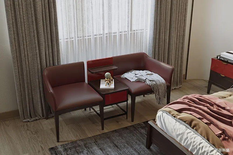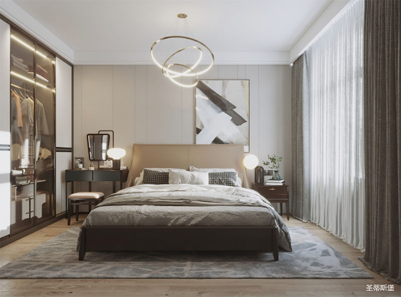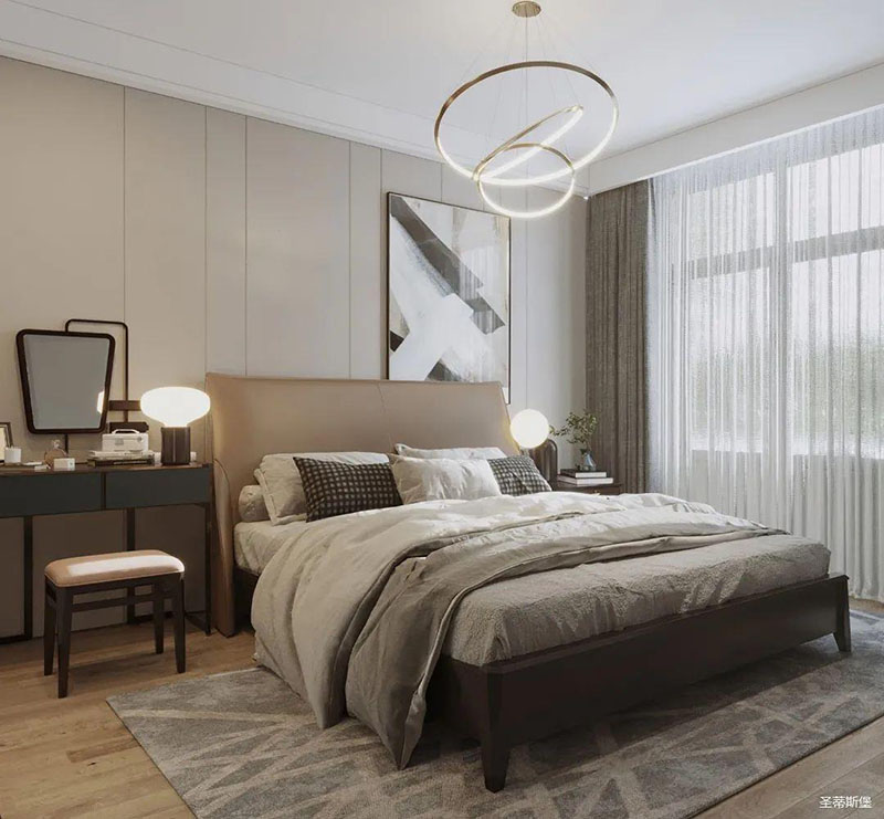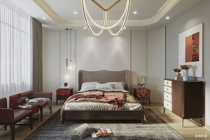 靈活變裝的主臥空間,自成獨(dú)特的設(shè)計語言與真摯的感情糅合。經(jīng)典意式極簡軟床,流暢順滑的真皮床屏,賦予了空間溫馨高貴的氣息。酒紅實(shí)木質(zhì)感的床頭柜,整齊擺放,欲有“鴻運(yùn)當(dāng)頭”的美好寓意,塑造出一方簡約知性的靈動空間。