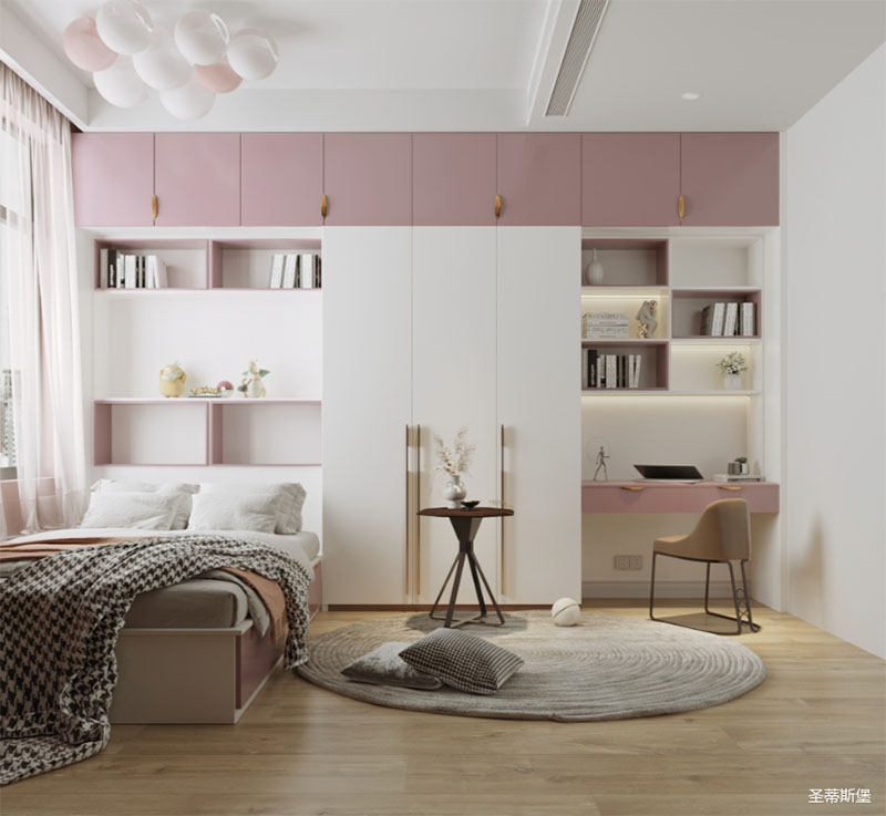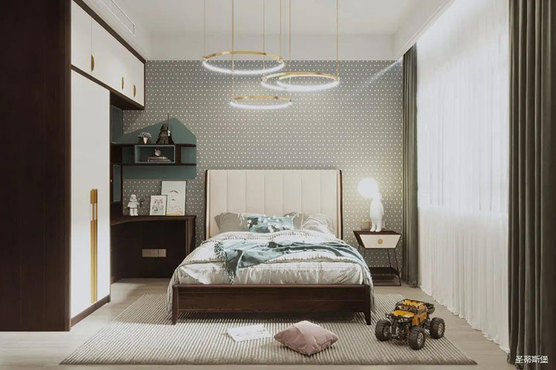 桌柜一體接壤設(shè)計,絢麗與沉穩(wěn)相互襯托,足以達(dá)到空間最好的狀態(tài)。飽和又柔潤的色塊,整齊坐落于床體柜身,通過極簡規(guī)劃分配,刻畫出完美的實(shí)木紋理。造型獨(dú)特的床前燈,像一抹陽光照進(jìn)心扉,散發(fā)著童真與夢幻的味道,形成了獨(dú)有的輕奢精致感。