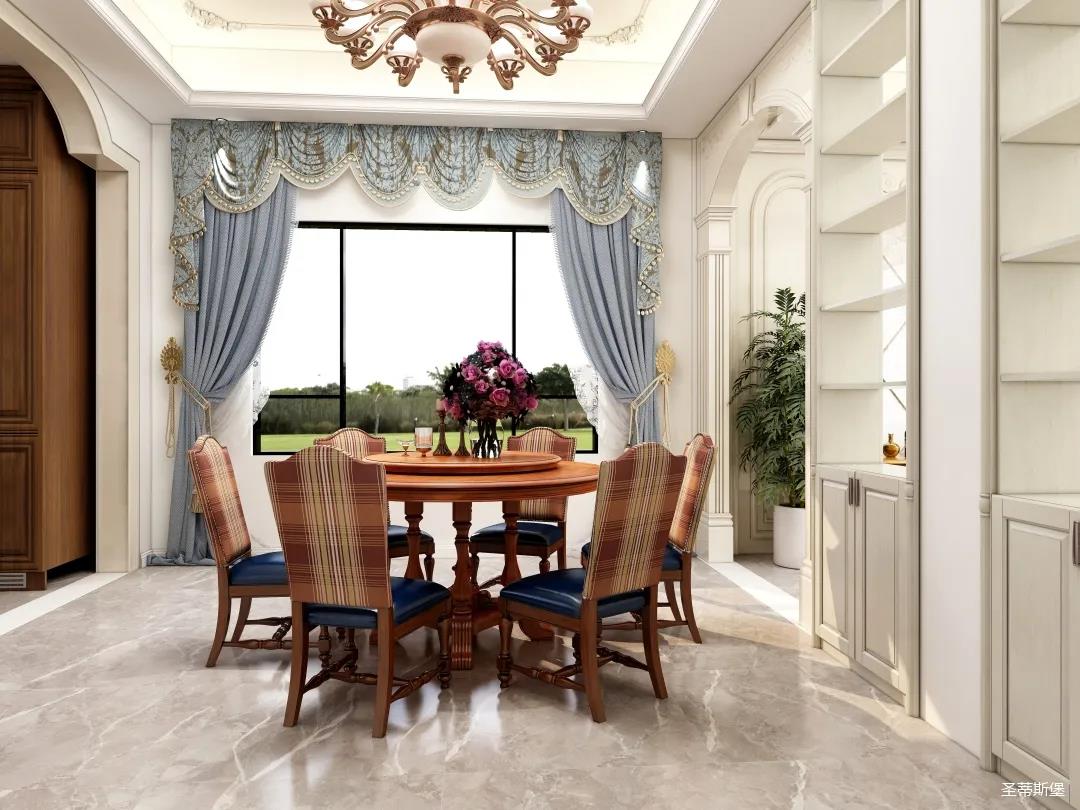 新古典風(fēng)格中填入少量的傳統(tǒng)裝飾,與美式和諧相融。精細(xì)的實(shí)木手工雕刻,傳統(tǒng)形狀的基礎(chǔ)韻味與美式的細(xì)節(jié)取長補(bǔ)短。不但富有審美的愉悅,更重要的是令居住舒適而貼近自然。背景墻更是復(fù)古與潮流的完美結(jié)合,具有經(jīng)典卻簡潔的圖案、復(fù)古卻時尚的色彩,既包含了古典風(fēng)格的文化底蘊(yùn),也體現(xiàn)了現(xiàn)代流行的元素。