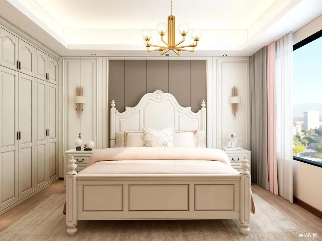 次臥的設(shè)計(jì)更注重收納,人性化嵌入式書桌,整排衣柜設(shè)計(jì)有效的利用了空間每一個角落。床屏在保持原有美式家具特色的同時,增加了線條美,將繁雜的雕琢簡化,并融入時尚的美式元素,壁燈,吊燈糅合自然光影,完美呈現(xiàn)出尊貴的空間格調(diào)。