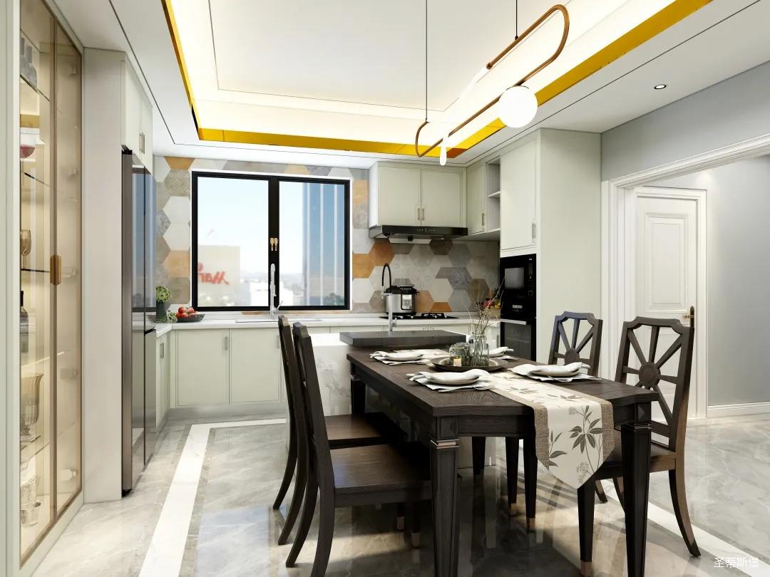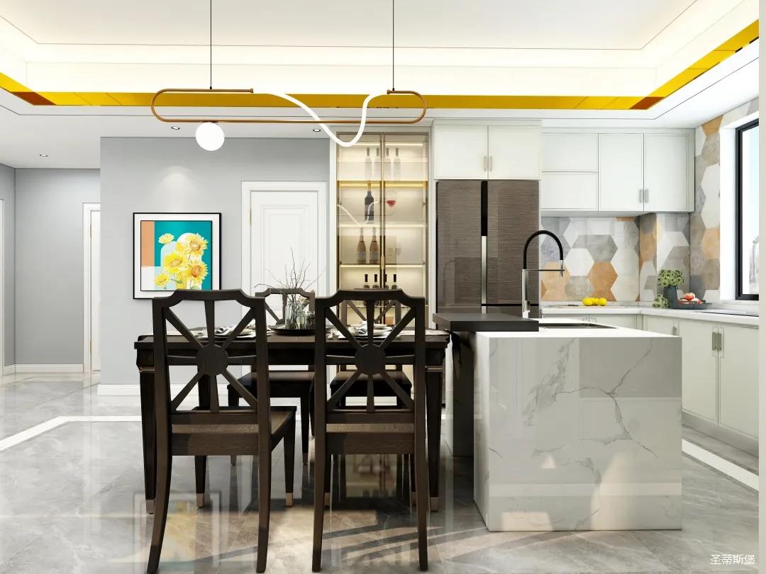儀式感的餐廚空間,應(yīng)在自然光影中跳躍。從設(shè)計搭配細節(jié)將美式開放,不設(shè)限的特性顯現(xiàn),實木餐桌線條簡約且剛毅,中島臺鏈接起用餐空間的隨性,不遺余力的拉伸空間的層次感。