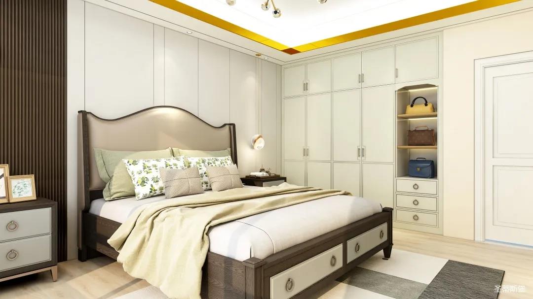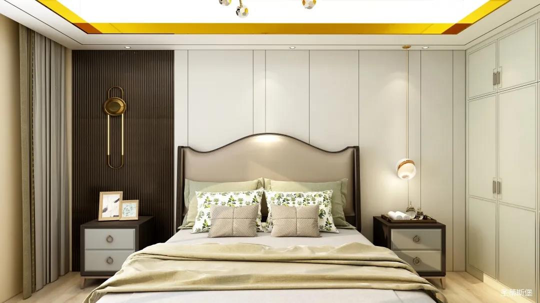簡約象牙白木飾面與棕色線性條紋木飾面等比劃分,從色彩裝飾上瓜分整個臥室空間,一面簡約雅致,一面低調(diào)奢美。