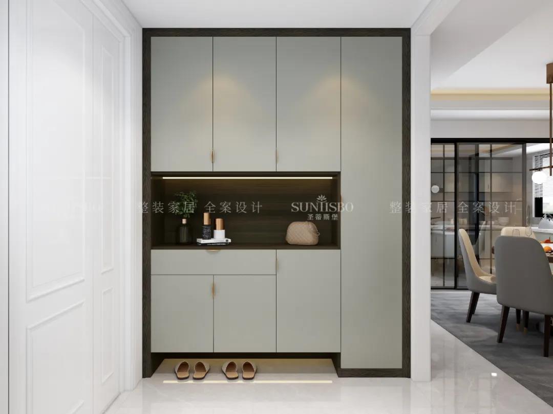 玄關(guān)吸納了極簡精華,采用極簡線條將入戶玄關(guān)模塊化分割,完成了一場精簡入戶的儀式感。煙熏色與淺灰色彩有序排列出一個個性的極簡入戶空間。