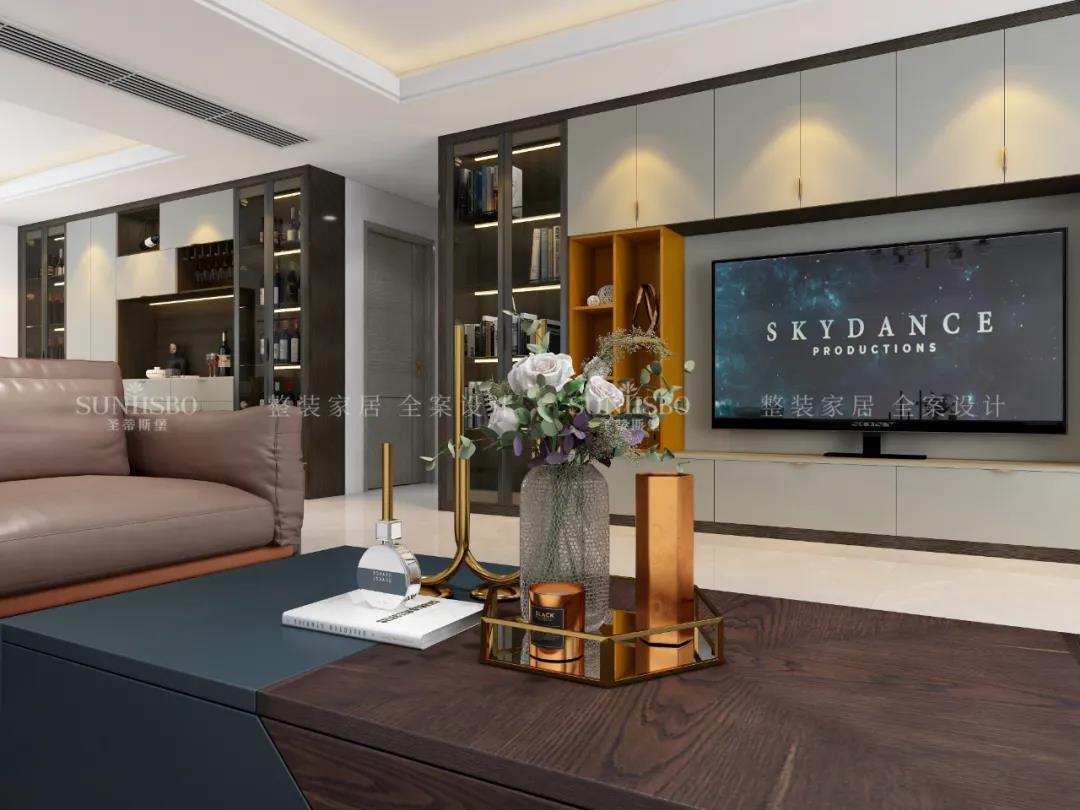 客廳一面置頂?shù)亩ㄖ乒瘢蟠笤黾恿丝臻g收納,也將電視背景墻的觀賞性發(fā)揮到極致。淺灰與明亮橙的“動靜”屬性,與沙發(fā)上的愛馬仕橙相呼應(yīng),從空間中漫溢出歡樂和跳動的樂章,回響生活中那一抹絢麗和精致,同時也擁有著對立且和諧的高級范兒。