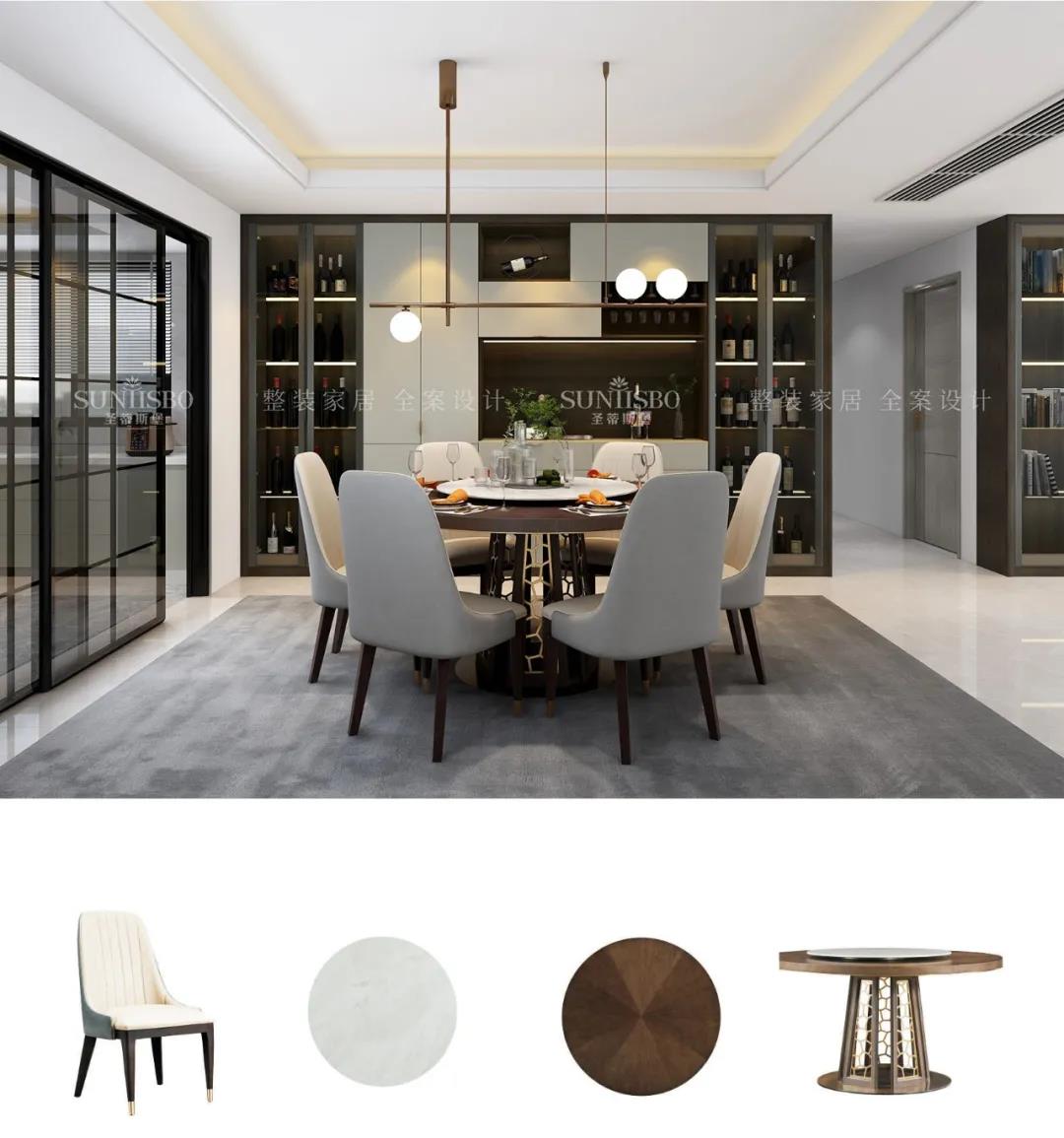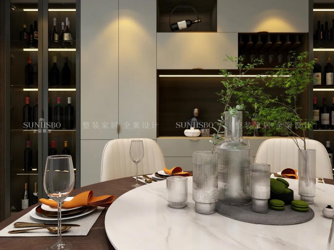 移步到餐廳空間,餐邊柜立面簡致,紋理細(xì)膩,展示區(qū)合理分配,增強(qiáng)了空間層次感,彰顯出飽滿的意式美感。實木柜面加以金屬拉手的裝飾,將極簡現(xiàn)代與高端質(zhì)感融合,以簡約的形式表達(dá)出“簡而不失其華”的感染力。