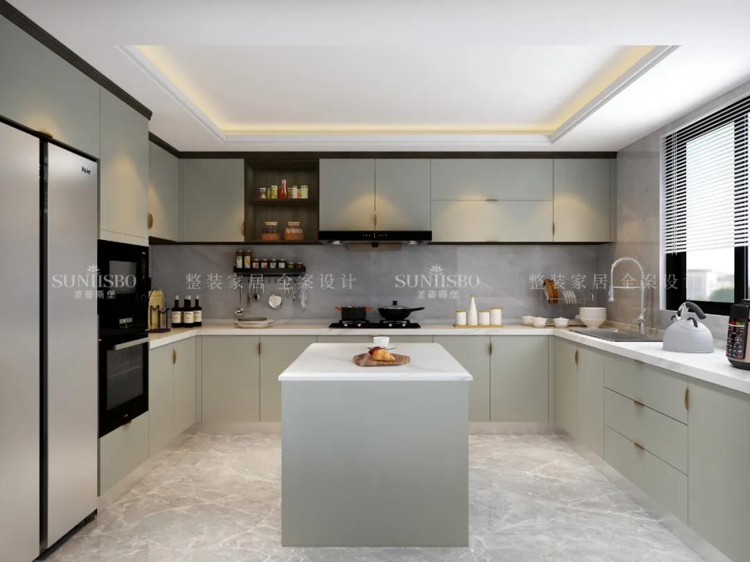 廚房的淺灰色調(diào)與明媚的自然光線重合,由空到滿,完成了一場空間與質(zhì)感的展示。案臺上擺放的居家生活用品,充斥著溫馨的生活氣息。質(zhì)感櫥柜線條秩序排列出廚房空間的簡約主題感。日光穿過百葉窗,將生活空間梳理的溫柔且愜意!