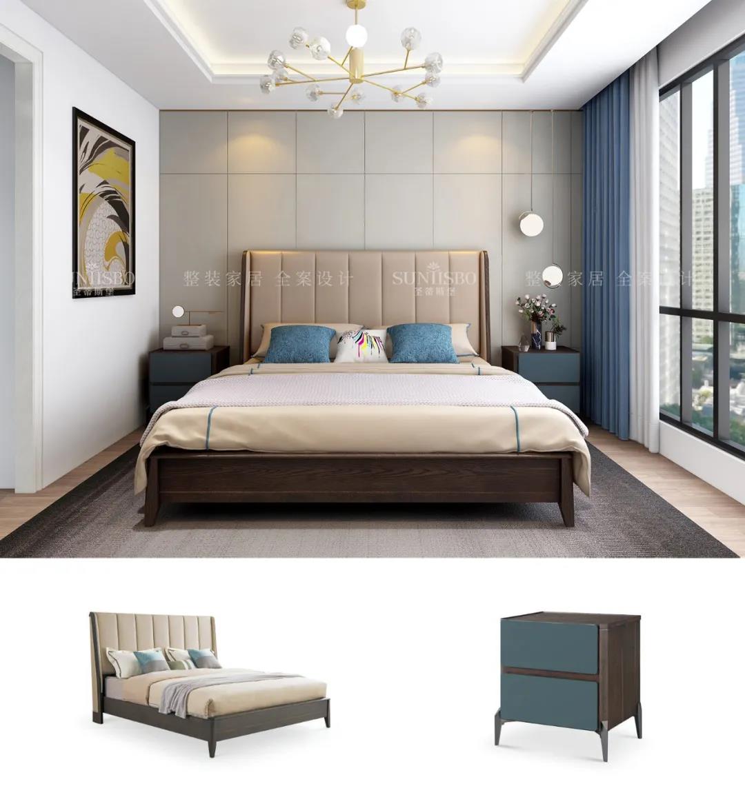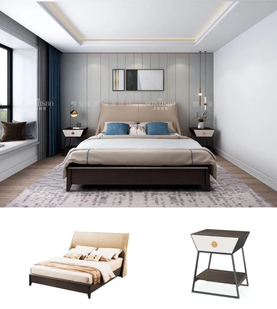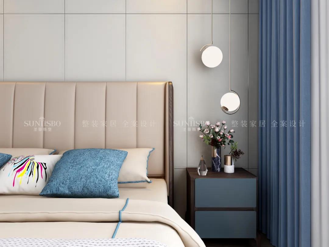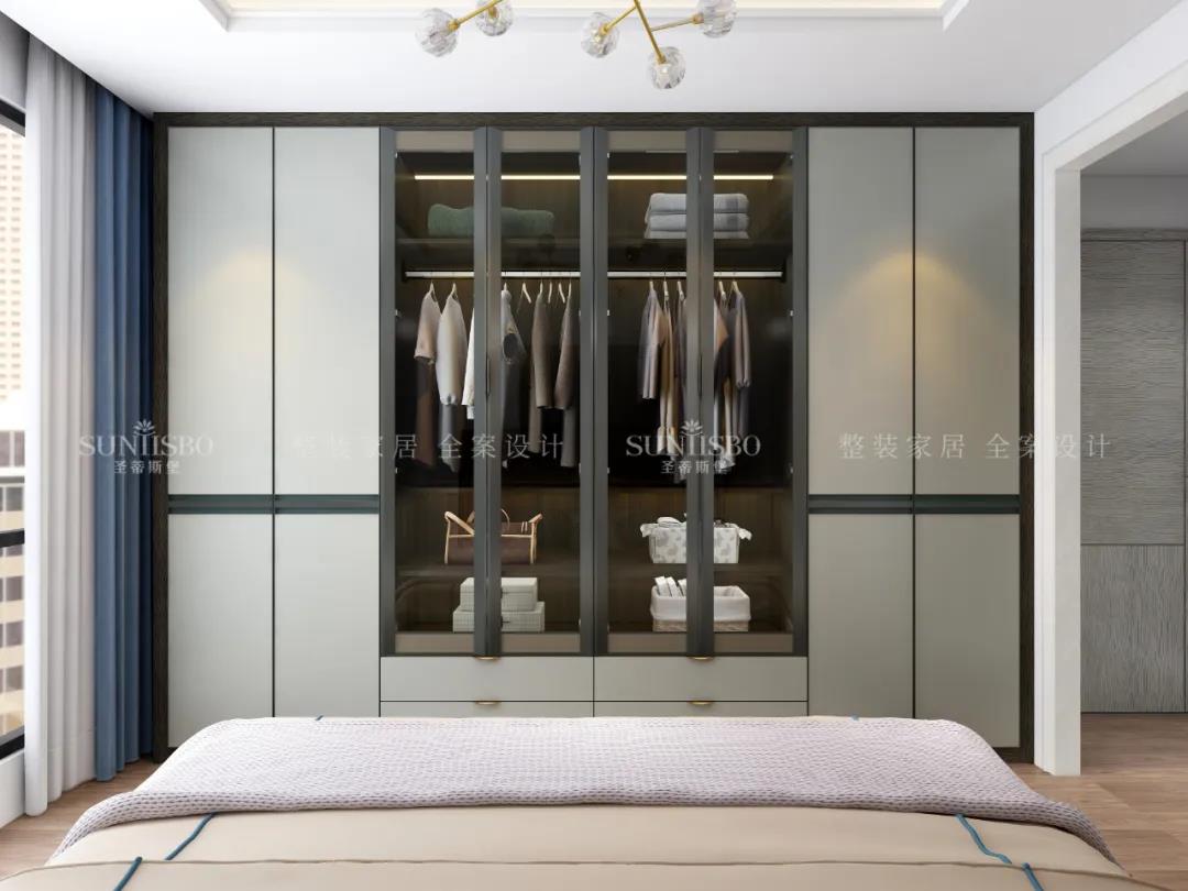 設(shè)計師運(yùn)用最為百搭淺灰實木護(hù)墻板打造主臥空間,簡約的線條縱橫交錯,帶來了干凈、清爽、舒適的視覺效果。明暗分區(qū)的衣柜在燈光的渲染下,虛實光影變換其中,為每個角落氤氳出浪漫的氣息。