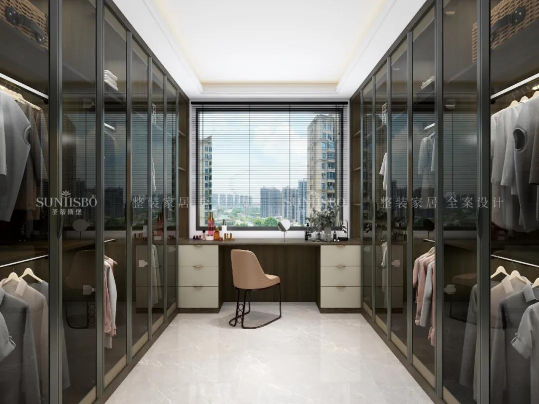 家的質(zhì)感,并不是用瑣碎的東西堆砌而成的,衣帽間是品質(zhì)生活的一個重要的指標(biāo)。這套衣帽間是以平行的格局設(shè)計成步入式空間,全開放式的呈現(xiàn),金屬與透明玻璃材質(zhì)的糅合,襯托出柜體高級奢華的質(zhì)感。