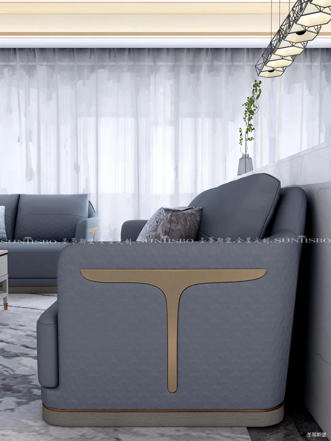 客廳風格當場敲定,入戶儲物玄關與客廳空間一體設計打破了傳統(tǒng)格局,延承了大平層的落地窗裝飾,軟裝窗簾三色搭配,低調(diào)又高級的霧霾藍延展了空間現(xiàn)代簡約的格調(diào)。