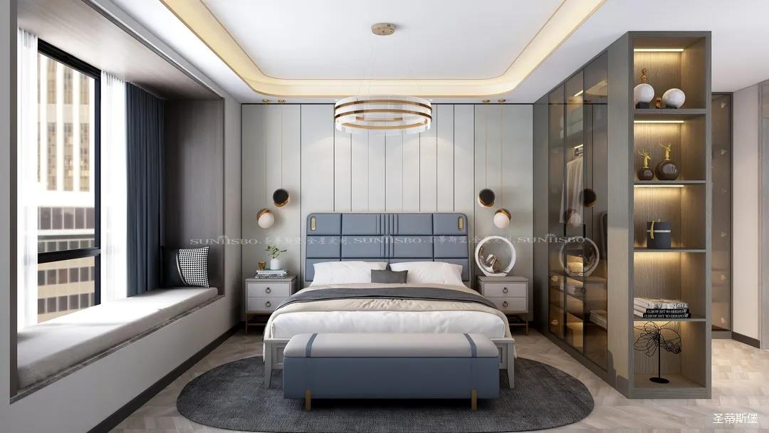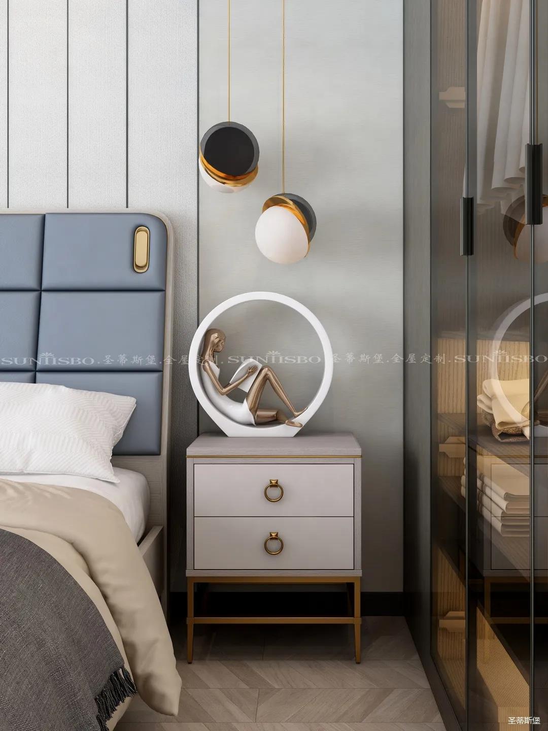 臥室的設計繼續(xù)延續(xù)著空間的高級灰,藍灰色彩的對比,讓主臥空間層次感更加豐富,充足的陽光隨意散落,空間更加溫暖大氣,對稱的球形吊燈設計,恍如兩個“快樂星球”,展現(xiàn)著空間應有的藝術性,設計師巧妙地設計,營造出與眾不同的生活品質(zhì)。