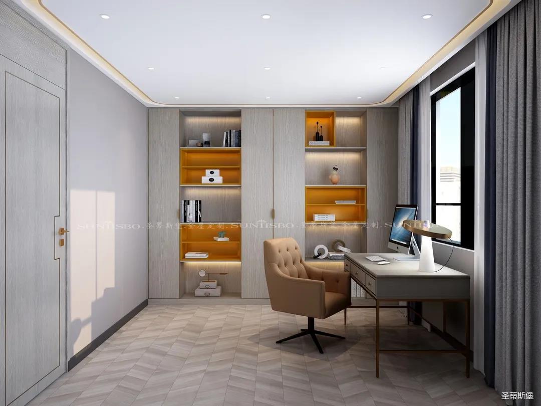 英倫仿古灰實木嵌墻書柜,結合同色系的時尚簡約書桌,整個空間都被自然氣息包圍。由于工作原因,加班也成為了生活中的常態(tài),簡約書房設計打破了平時忙碌的生活,也為心中尋得那一方心靜之地。
