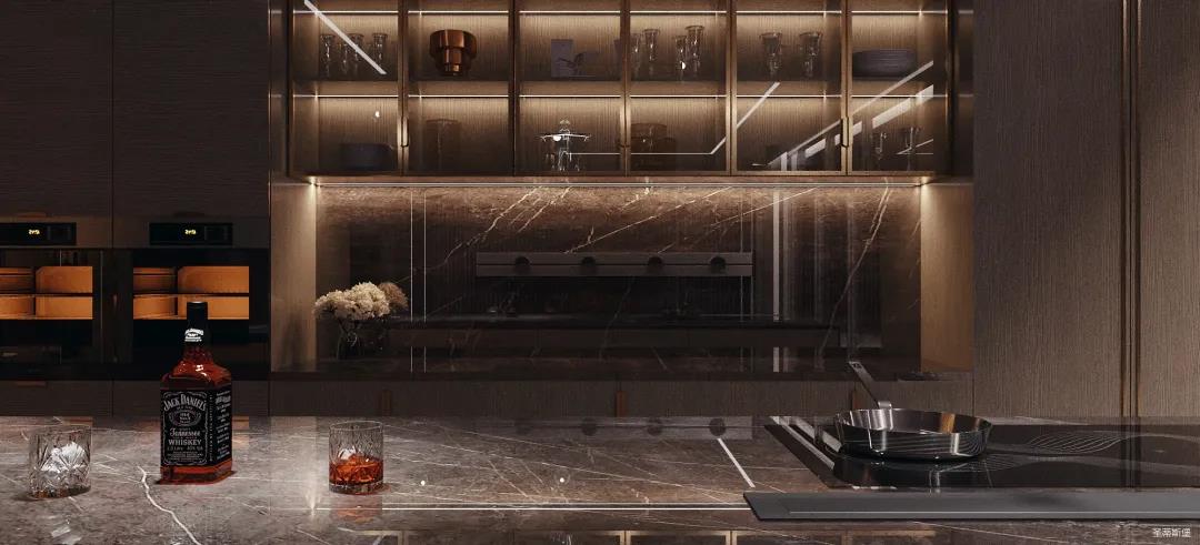 餐廚的極簡也可兼具多元,以一字內嵌式展開的廚區(qū)收納柜,兼顧了從杯具、調料等廚用材料收納到廚電歸置動線功能處理。在展示區(qū)域,玻璃隔板組合實木定制柜的表現(xiàn)形式,更是提升了空間的明亮度與寬闊感。