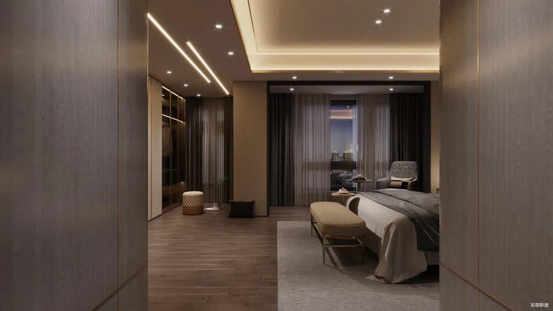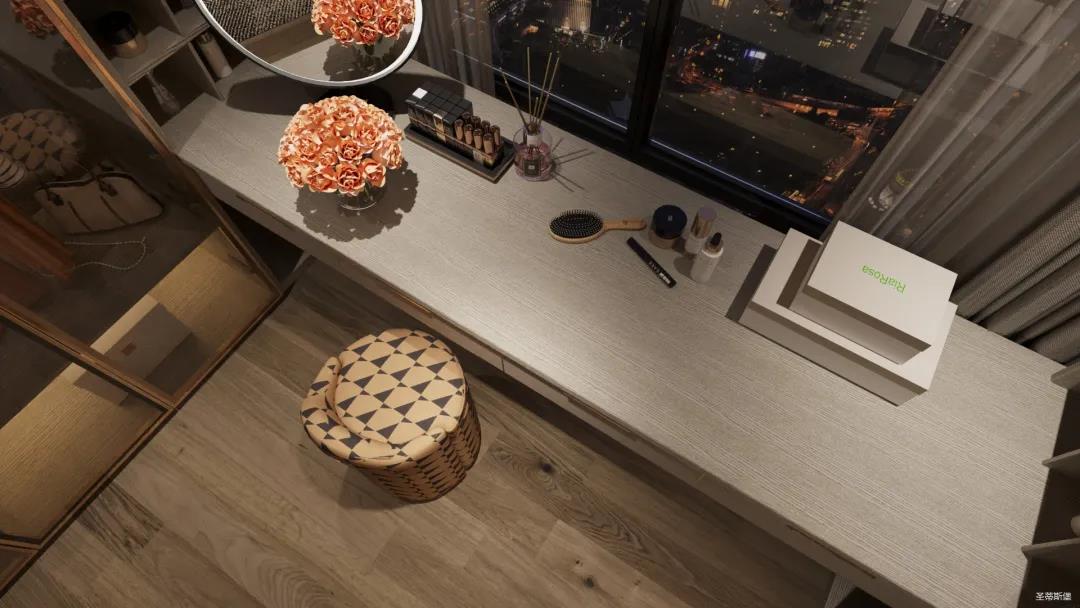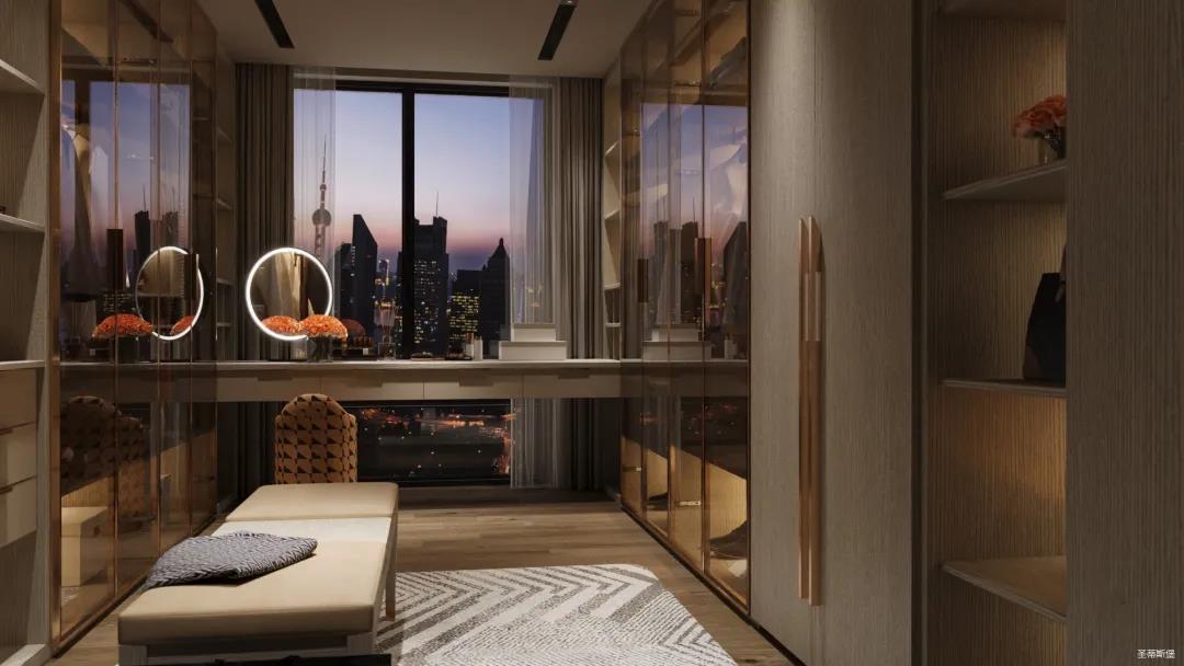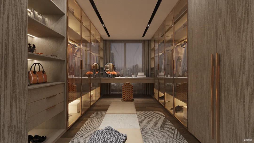 移步衣帽間,精簡華麗幾乎貫穿了整個空間,質感高級的實木定制柜框架、通透明亮的玻璃展示區(qū)、色調醇厚的金屬鑲邊,每一項細節(jié)搭配都在強調著業(yè)主的高端品位。妝臺前的落地窗讓我們在觀賞都市繁華的同時也屏蔽了都市喧囂,讓我們置身于繁華都市中有一處寧靜休憩地。