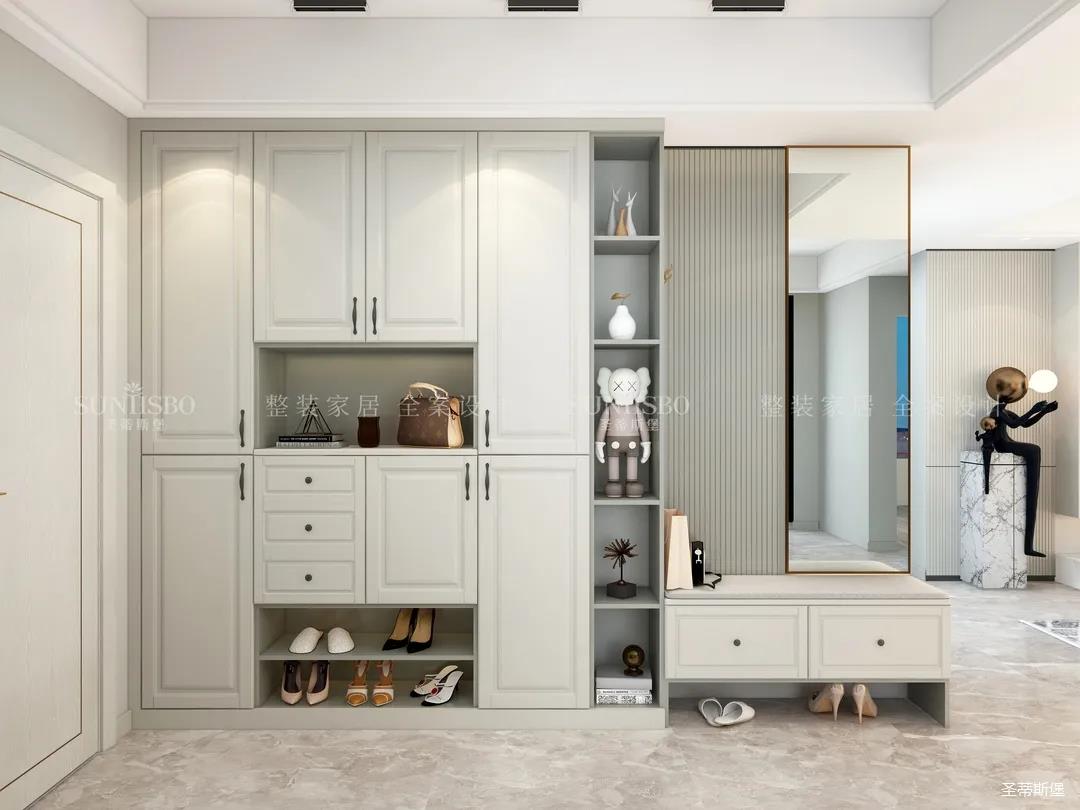 入戶側(cè)面設(shè)計一字型玄關(guān),腰部,底部留空做層板,便于隨手放置鑰匙、鞋包等物品,中間留空設(shè)計為開放展示區(qū),加上軟裝飾品點綴,達(dá)到業(yè)主對品質(zhì)生活追求的理想狀態(tài)。應(yīng)女主人要求,玄關(guān)還加長延伸出妝鏡和換鞋凳,讓動線自然流暢。