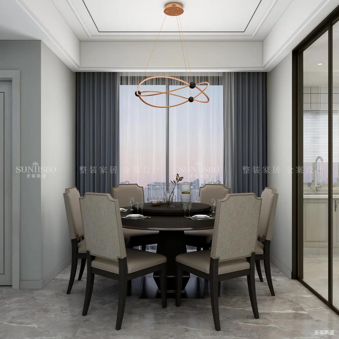 餐廳空間由于戶型空間有限,僅用淺色的護(hù)墻與深色的餐桌椅,在視覺上加深空間的縱深感,打造了滿足用餐、會客、社交的多重需求空間,把業(yè)主對一家人圍桌用餐的憧憬變成可落地居家場景。
