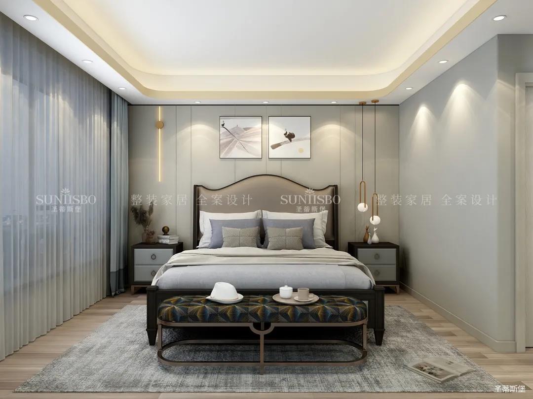 主臥整體暖色色系為空間注入了專屬調(diào)性,高明度的家具色彩與整體空間區(qū)分,透過材質(zhì)肌理與光線相互交疊,傳達(dá)著空間里安定溫暖的情緒。立體輕奢的床尾凳,提示著空間主人對時尚的高質(zhì)量生活追求。