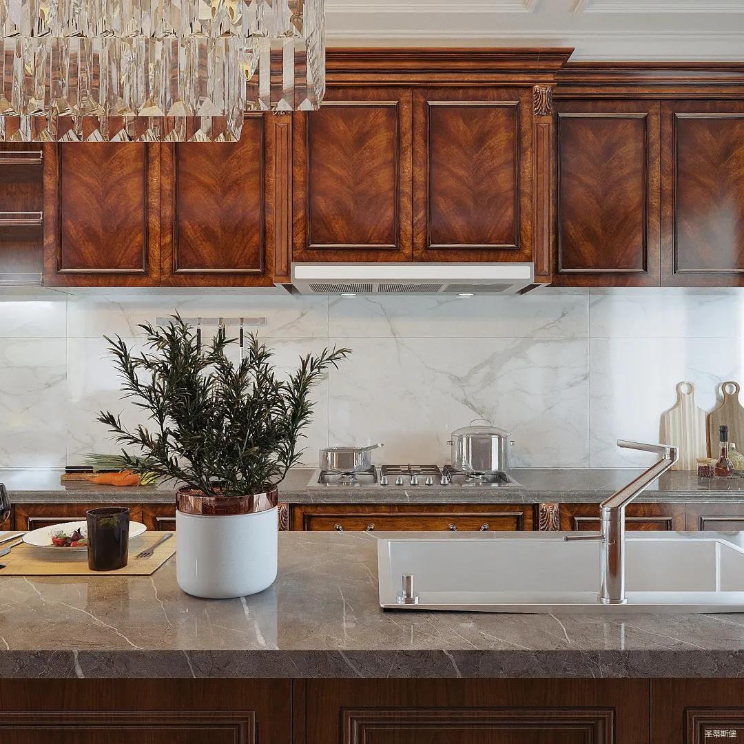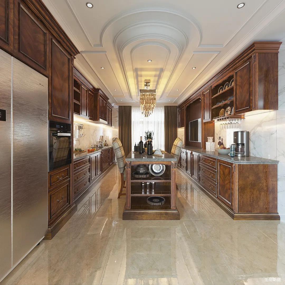 西廚設計更為統(tǒng)一,女業(yè)主喜好柔美優(yōu)雅的視覺效果,因此設計師特意將吊頂轉(zhuǎn)角做了圓弧處理,使冷峻的空間略帶圓潤,形成精致協(xié)調(diào)的空間格局。簡潔的石膏吊頂與吧臺一致延伸,讓廚房視覺空間得以擴大。金屬元素水晶吊燈,增加了空間的精致感,美式定制柜體將古典元素與現(xiàn)代電器相糅合,交錯產(chǎn)生一種自然的違和感。