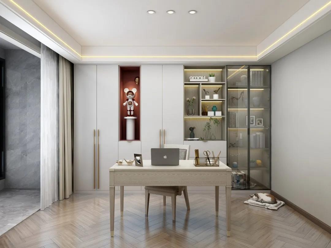 書柜以虛實結(jié)合的體塊感呈現(xiàn),疏密不一,相異的色調(diào)在橫縱間碰撞交錯,演繹靈動隨性之美,踱入書房,這一隅是閱讀、辦公最好的場所。