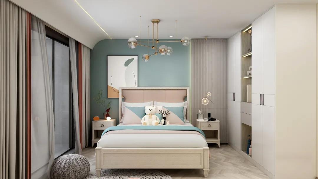 次臥淺灰色的背景墻時尚又內(nèi)斂,入目盡顯舒適的視覺感,為了避免過于單調(diào),特意搭配了與整體保持一致的拼色窗簾,作為空間色彩的點綴。
