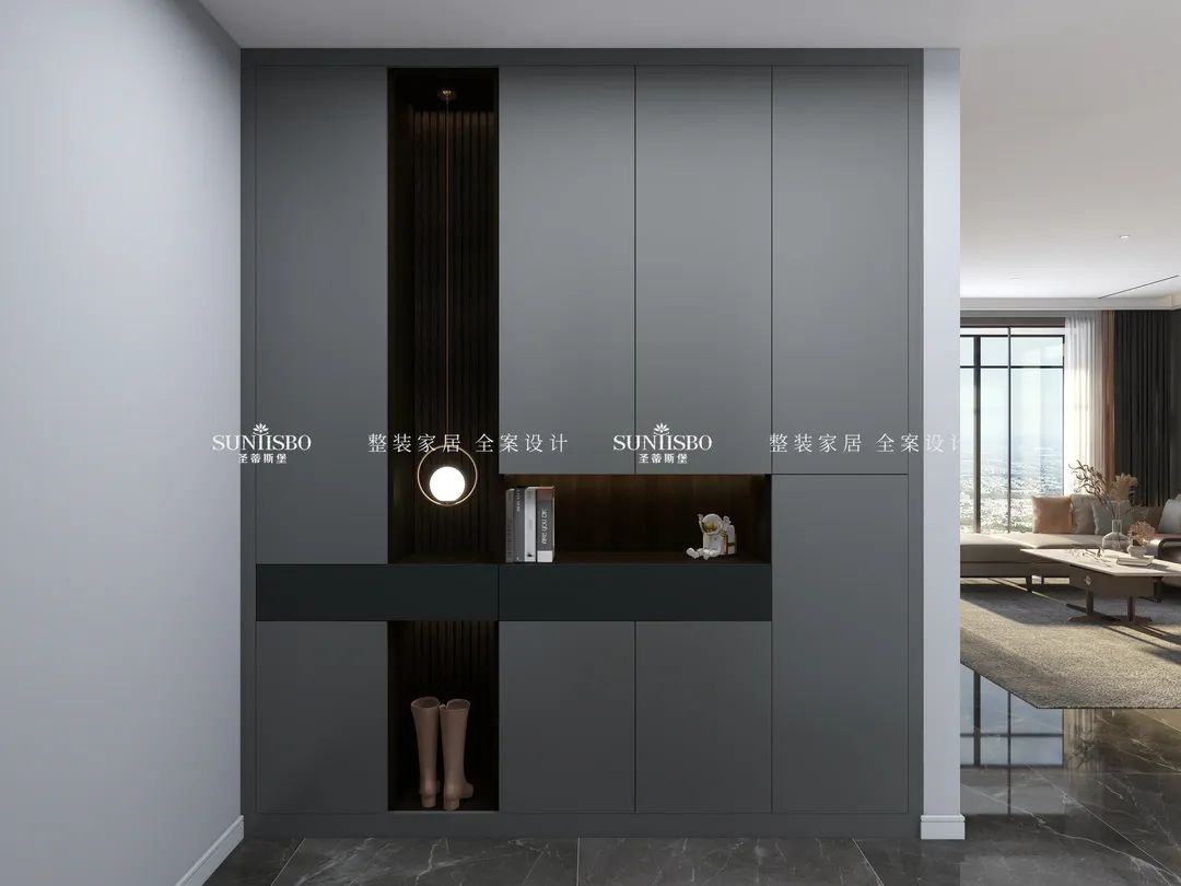 入口玄關(guān)處講究極致簡潔,摒棄繁雜的設(shè)計(jì)元素,地面磚體采用與柜體相近的色調(diào),在界面轉(zhuǎn)折的地方著重連貫統(tǒng)一,讓入戶空間呈現(xiàn)科技立體感,趣味十足的藝術(shù)品擺放,使整體顯得高級又有顏值。在其中通過點(diǎn)狀燈光設(shè)計(jì),帶來躍動而富有生命力的視覺焦點(diǎn),展現(xiàn)出現(xiàn)代時(shí)尚感。