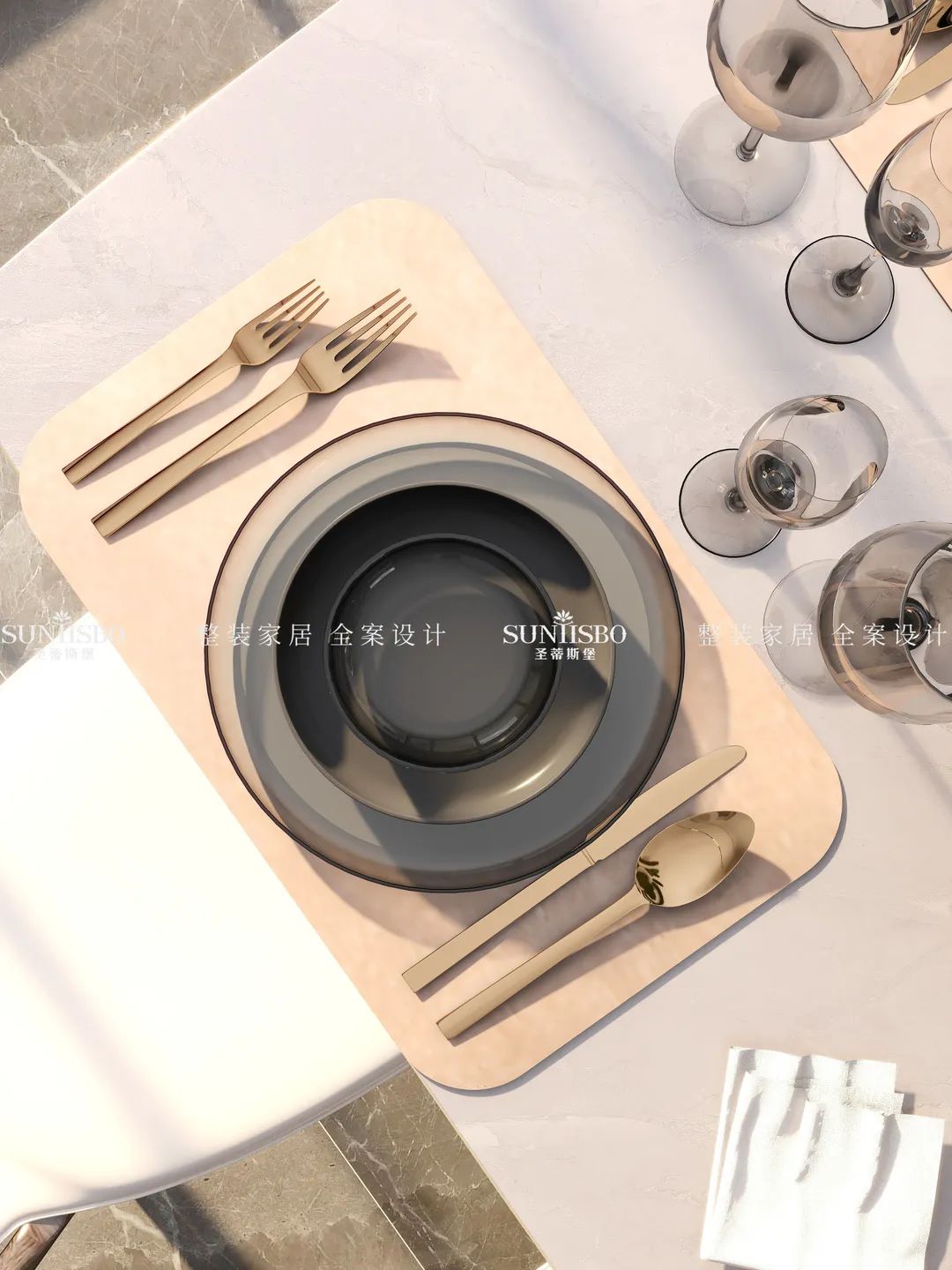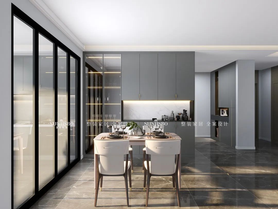 餐廳的設(shè)計(jì)采用整墻定制的餐邊柜,高級灰讓空間調(diào)性瞬間得到提升,半透明的玻璃展示區(qū),營造了多樣的空間和充滿極簡藝術(shù)氣息的生活體驗(yàn)。